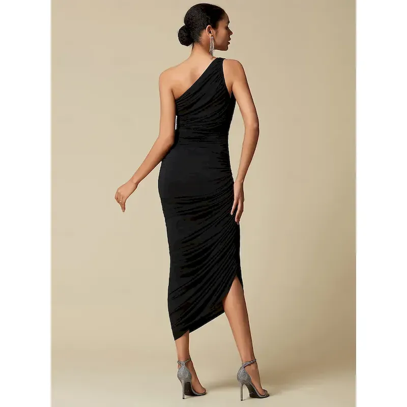 Black Elegant Party/Wedding Guest Ruched Sleeveless One Shoulder Elegant Midi Dress dress to impress 2024 2025