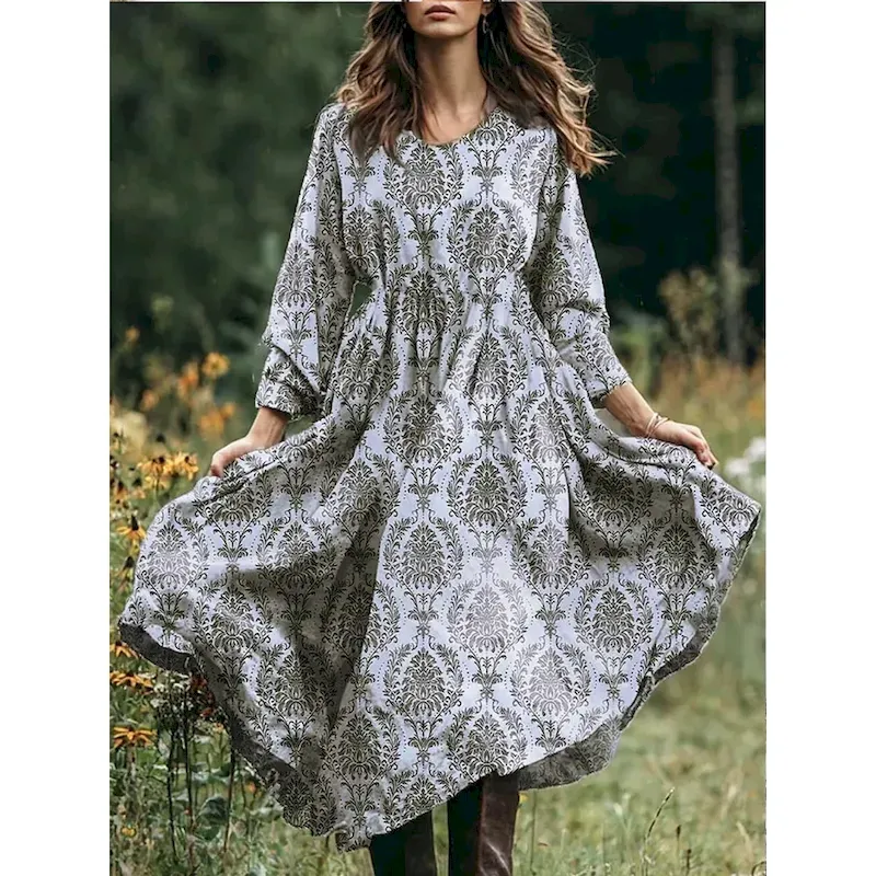 Women’s Midi Dress A Line Dress Vacation Casual Boho Beach Loose Fit Floral Graphic Paisley Long Sleeve V Neck Pink Blue Purple Green Spring Fall Wint