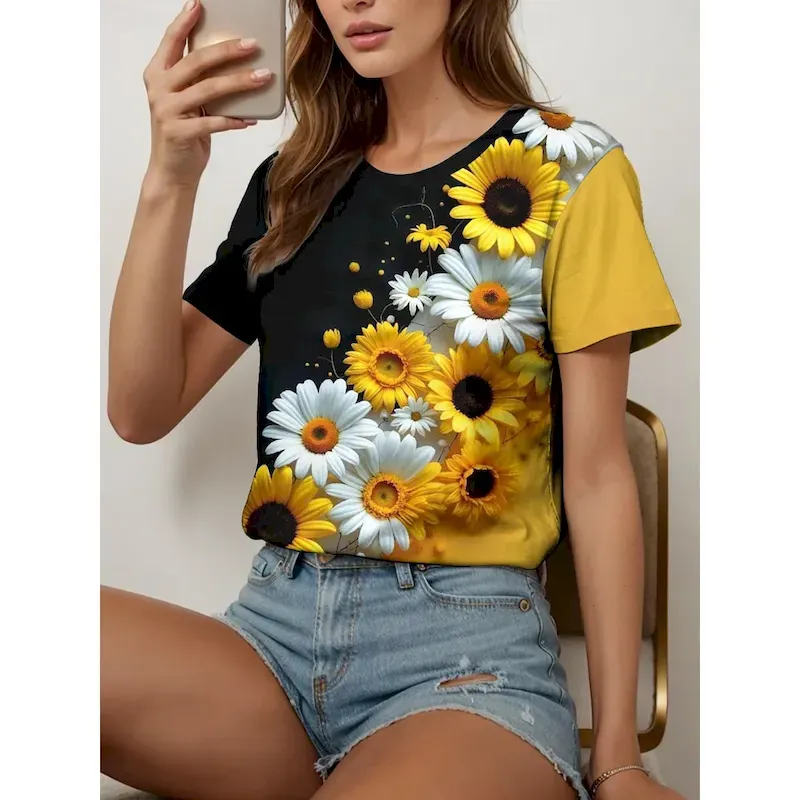 Women’s T Shirt Floral Graphic Plants Vintage Stylish Classic Short Sleeve Crew Neck Round Neck Regular Tops Daily Print Black and White Yellow Blue P