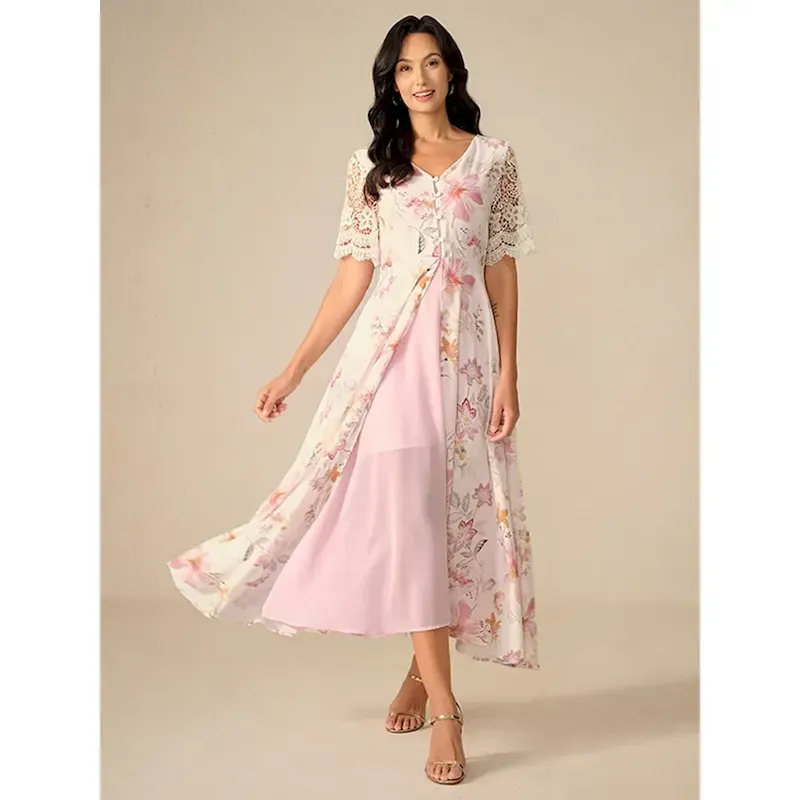 Women’s Wedding Guest Cocktail Dress Floral Lace Button V Neck Maxi Dress Elegant Stylish Party Short Sleeve Summer 2025