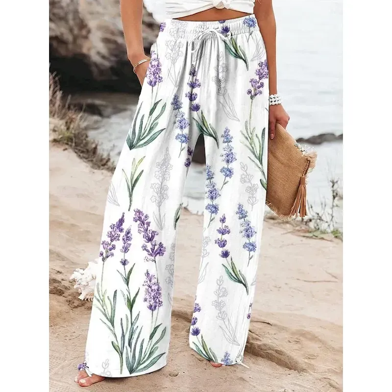 Women’s Wide Leg Baggy Pants Beach Shorts Vacation Vintage Fashion Full Length High Waist Graphic Flower / Floral Drawstring Printing Soft Breathable